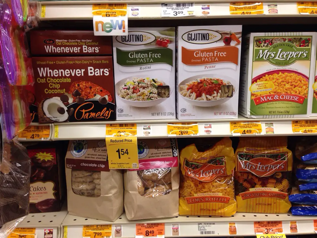 Aux États-Unis, il est très facile de trouver ce genre de produits (gluten free) dans les supermarchés. Cette indication est clairement affichée sur beaucoup de produits. Il y a même des rayons entiers indiqués Gluten free avec des produits sans gluten !