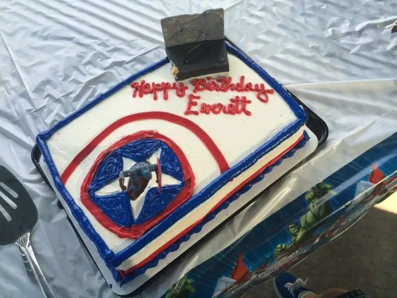 Après avoir mangé le repas (des petits légumes crus, des trip tips, du poulet grillé, du pop corn, des fraises et des quartiers d’oranges), nous avons mangé le gâteau. Un gâteau décoré à l’américaine ! Il était très bon. Voyez par vous même (le visuel hein, pas le goût).