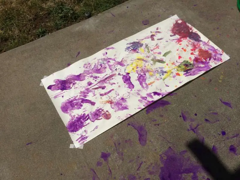 … ma seconde a renversé un pot de peinture ! A partir de là, elles se sont amusées à faire leurs empreintes de mains et de pieds et à en mettre partout !