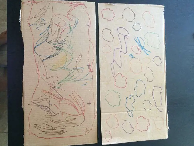 - J’ai découpé deux planches de cartons dans des cartons que j’avais au garage et mes filles ont dessiné dessus. Chaque planche fait 60*30 cm.