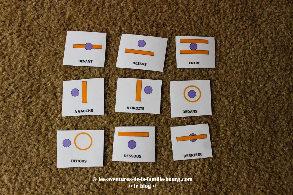 Un autre petit jeu que j’ai trouvé pour ma Loulou : des cartes pour apprendre à se repérer dans l’espace en apprenant du vocabulaire tout en visualisant facilement la situation.