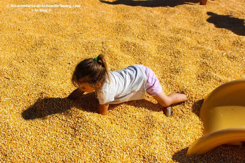 Il s’agit en fait d’une piscine de grains de maïs pour les enfants. Il y a même un toboggan !