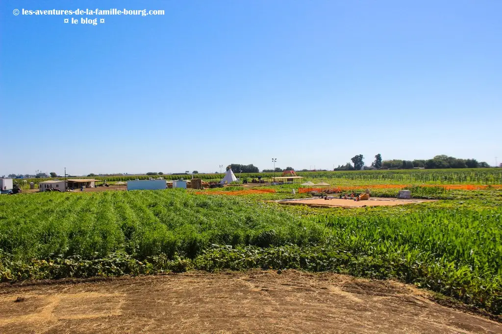 On a une belle vu sur ce pumpkin patch : la piscine de maïs, le pont orange du labyrinthe de maïs, le tipi.