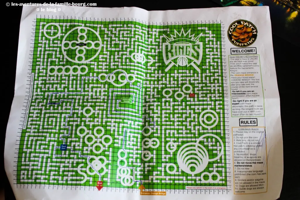Nous payons $12 par adulte (les enfants sont gratuits) pour pouvoir accéder au labyrinthe de maïs. La dame nous donne le plan du labyrinthe (un indispensable vu la taille). Si vous venez faire ce labyrinthe, pensez à emporter un stylo afin de pouvoir écrire sur le plan et indiquer votre trajet (et ainsi éviter de vous perdre).