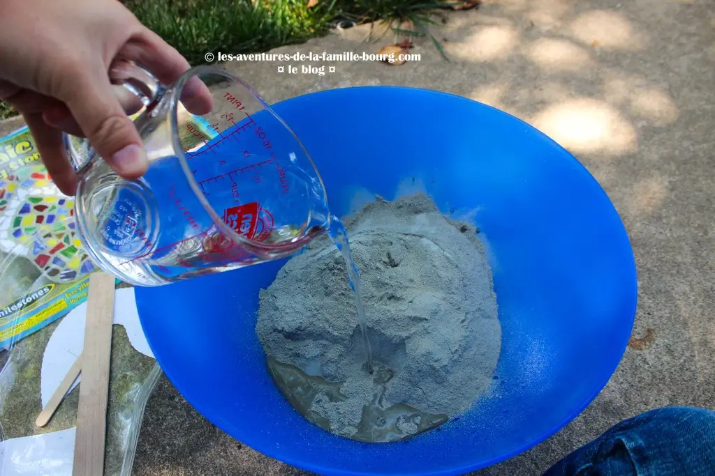 Il contenait des morceaux de verre colorés, du sable à ciment, un bout de bois pour touiller, deux moules, des papiers pour délimiter la lanière des tongs et un mode d’emploi.