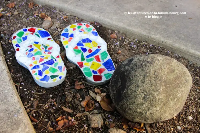 Après 3 jours de séchage, les tongs étaient finies et ont trouvé leur place dans notre jardin !