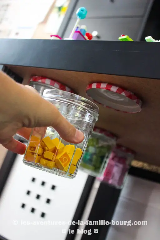 Il est ensuite facile de dévisser les pots de confiture et d’utiliser les Lego qui sont rangés dedans…